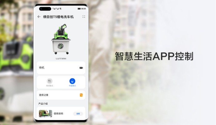 全新版本的绿田洗车机支持连接华为鸿蒙系统Harmony OS。在支持鸿蒙系统的手机设备中,用户打开手机智慧生活APP( 或NFC功能)以及绿田清洗机开关,设备即可成功连接成。通过手机端可随心切换常规、节能两种压力模式。并可以通过手机端实时在线查看设备电量及使用记录,方便用户了解设备状态,管理设备,带给用户更高效便捷的智慧生活体验。